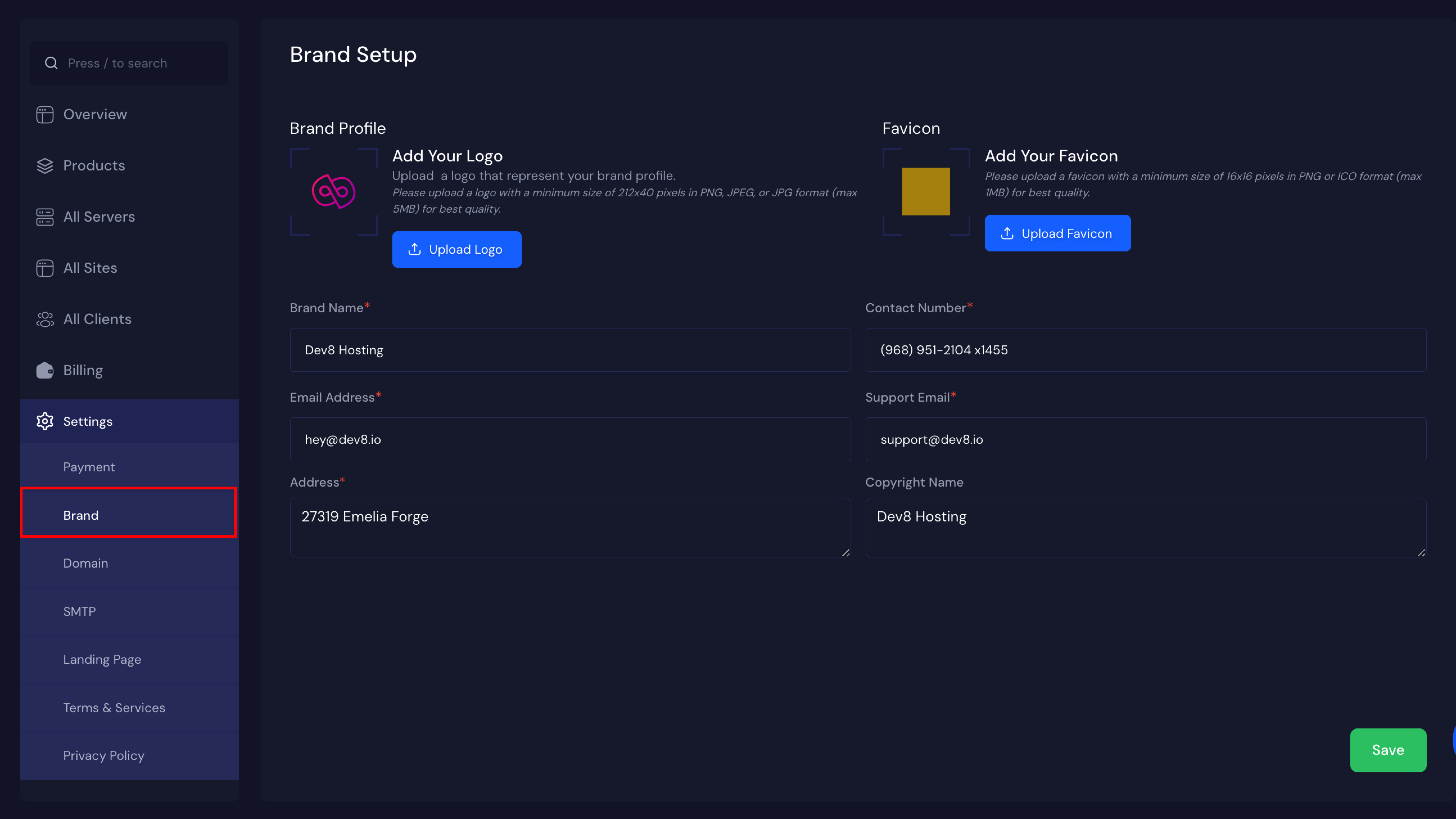 You can set up the brand logo, and favicon and also customize brand details from Brand Settings.