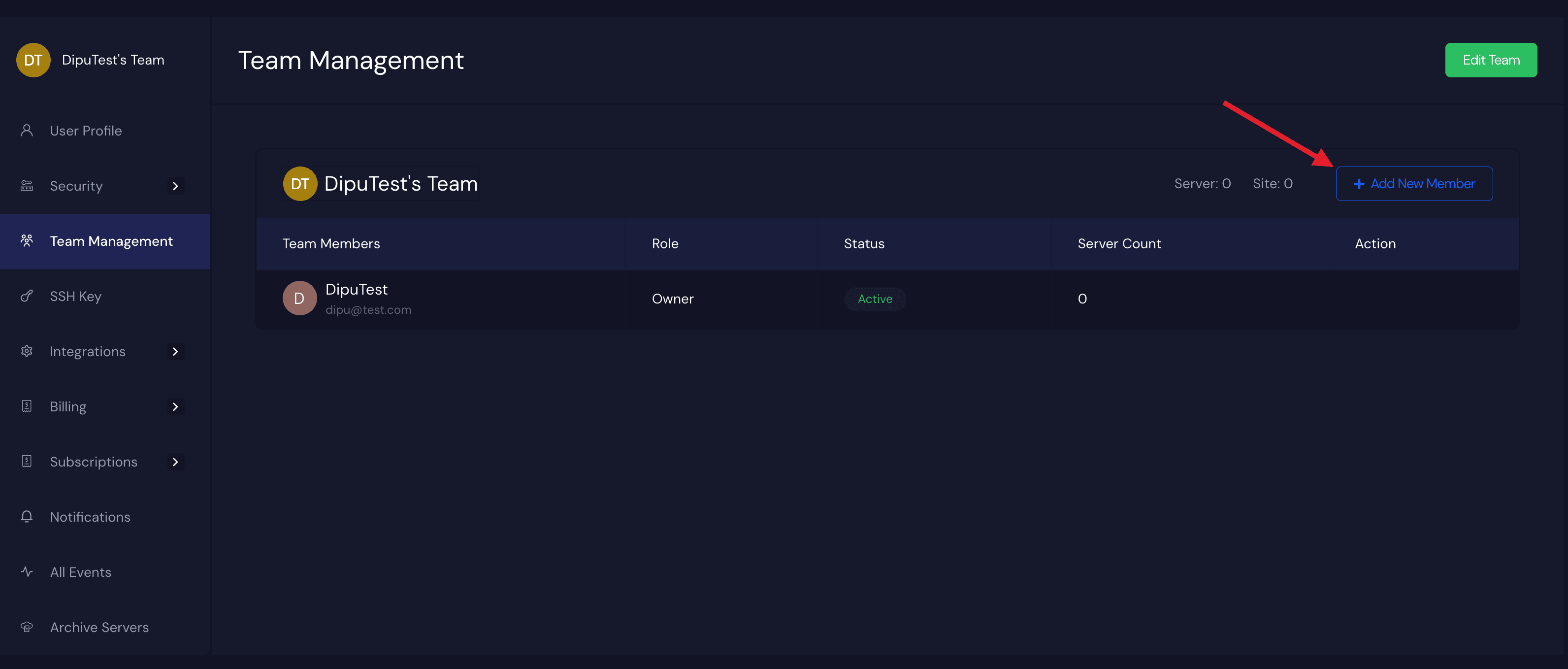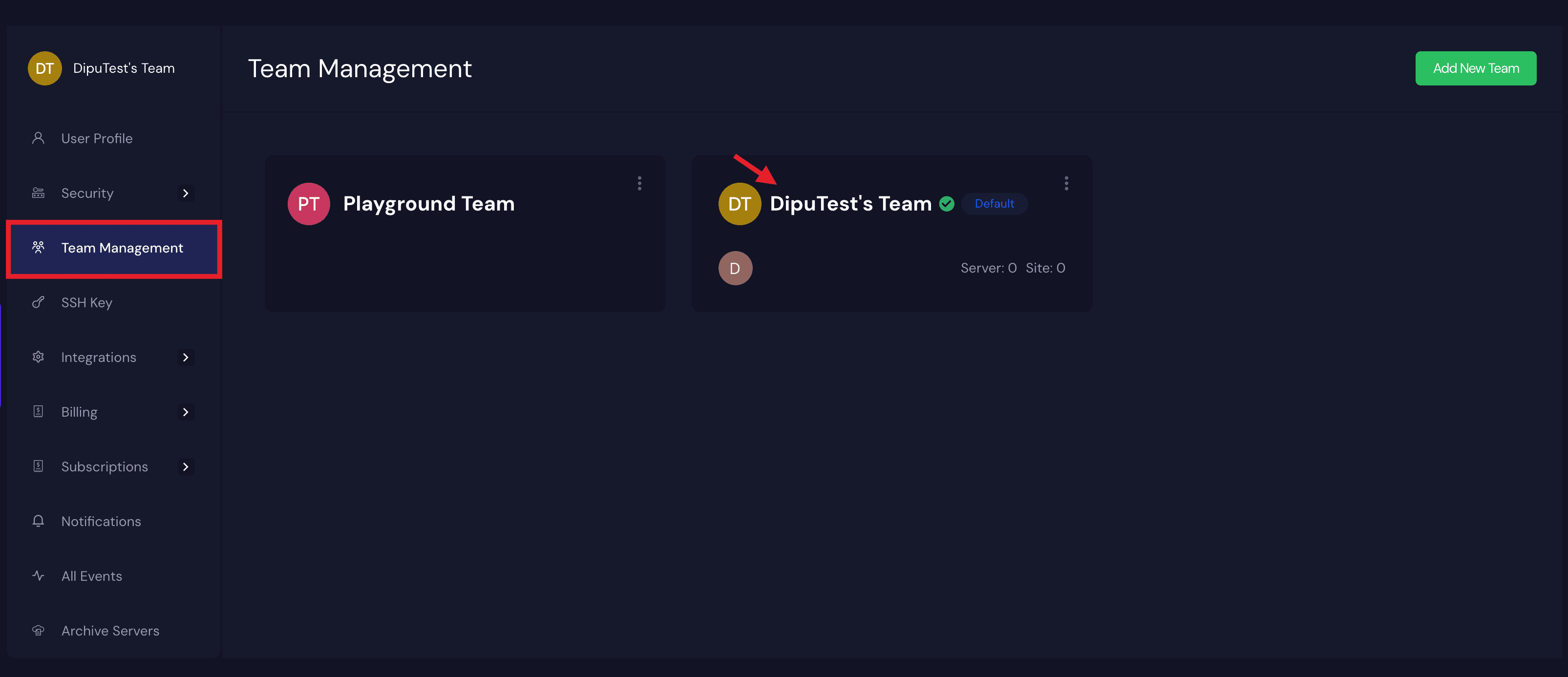 Visit the Profile Dropdown and click the New Team button. Or Visit the Team Management section and click on the Add New Team button.