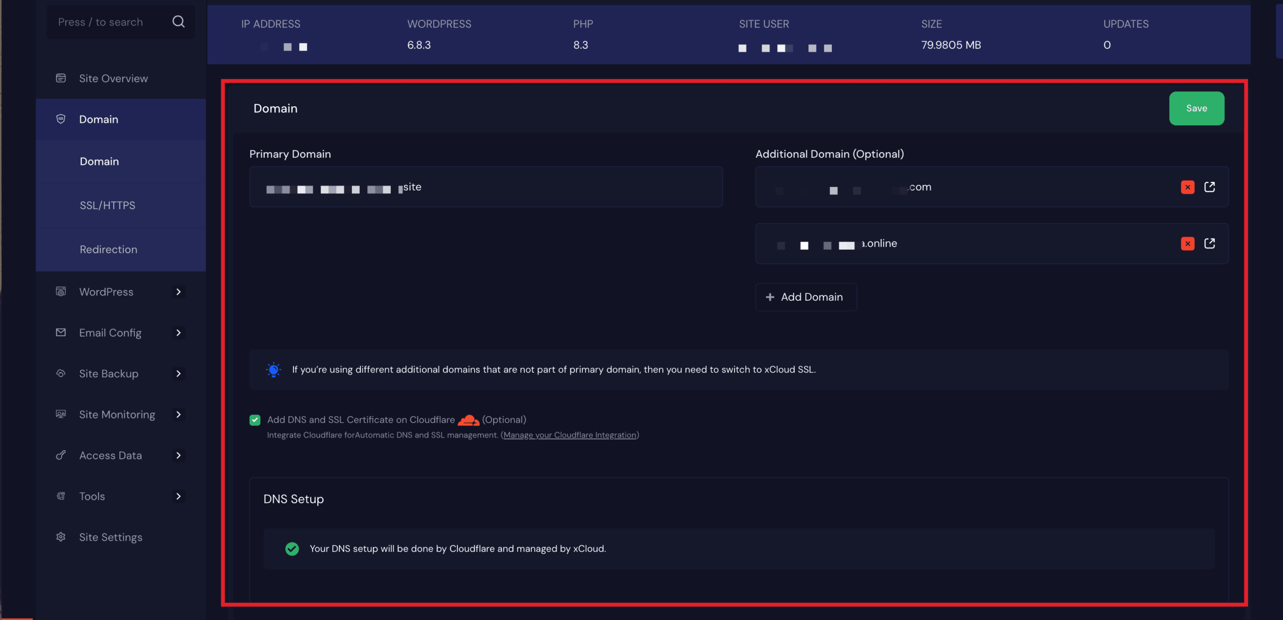 With xCloud, you can now connect multiple domains to a single site through Cloudflare Managed Sites. This means you can set up a primary domain (for example, example.com) and then add โAdditional domainsโ (such as sample.com or demo.net) to point to the same site. Next, click the check mark button of โAdd DNS and SSL certificate on Cloudflareโ to verify the DNS setup in 1 click.