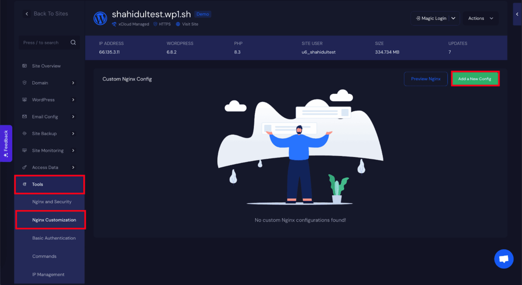 Now to Whitelist any firewall rules navigate to the pen โToolsโ โ โNGINX Customizationโ in your site dashboard. Then, click โAdd a New Configโ. Enter the whitelist rule using NGINX syntax.