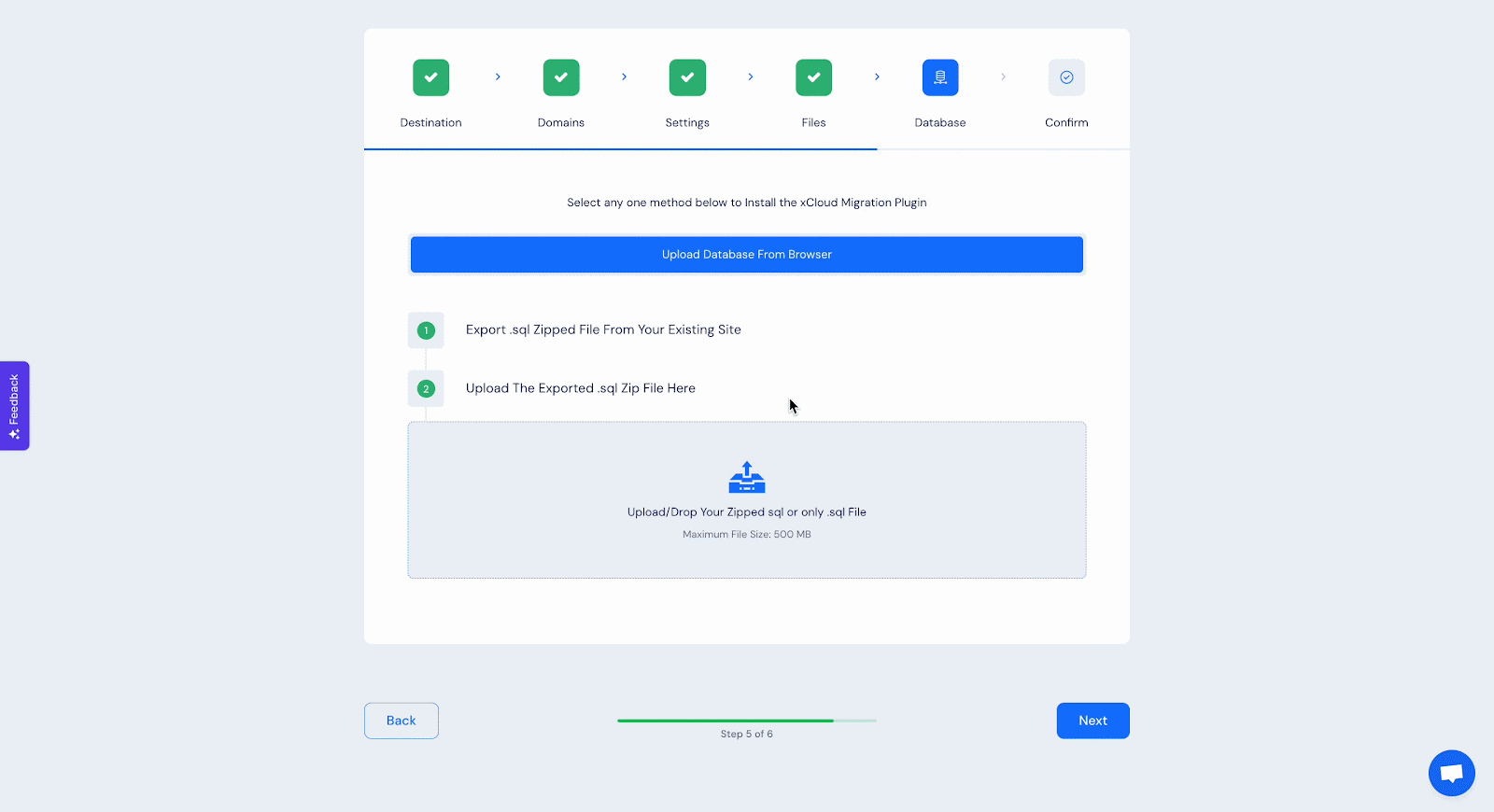 Now, you need to upload your exported WordPress file and click on the ‘Next’ button. In the next step, you have to upload your SQL file.