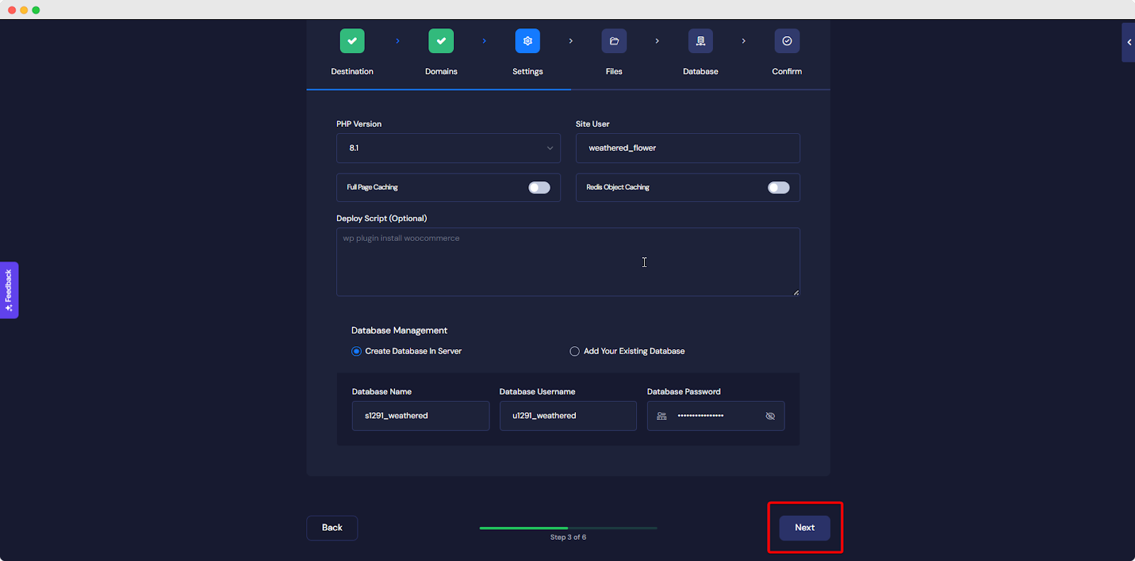 Now, add your PHP Version, Prefix, Site Users, and other details. Once you are done click on the ‘Next’ button.
