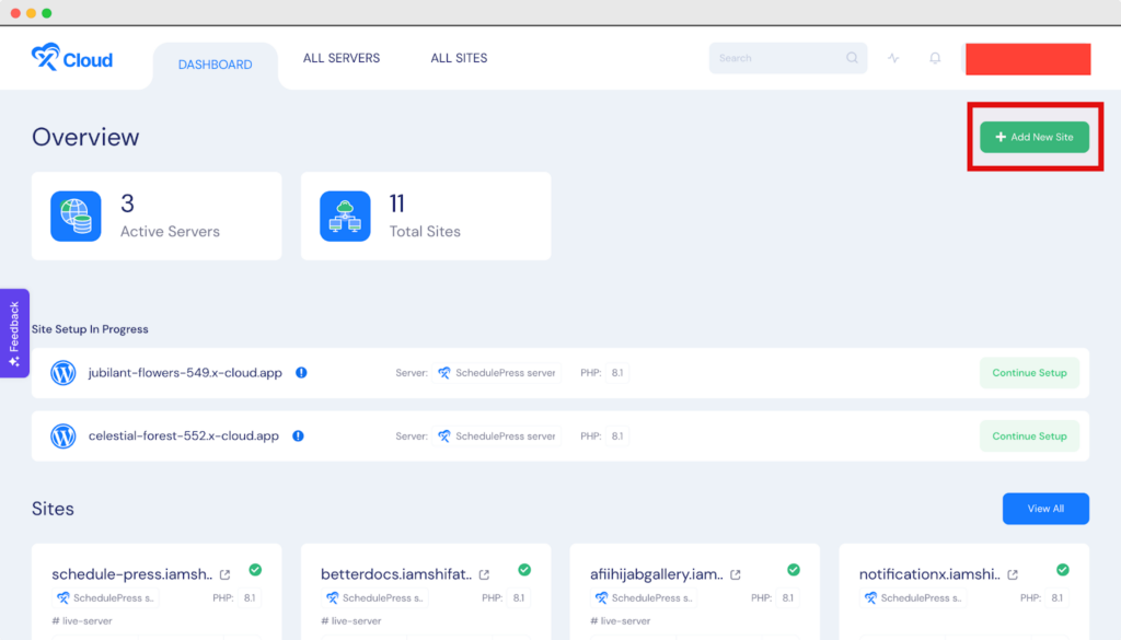 First of all, log in to xCloud and then click on ‘New Site’ from the xCloud dashboard. Then choose the cloud server where you want to upload your website. Afterward, you will be redirected to the xCloud site creation dashboard.
