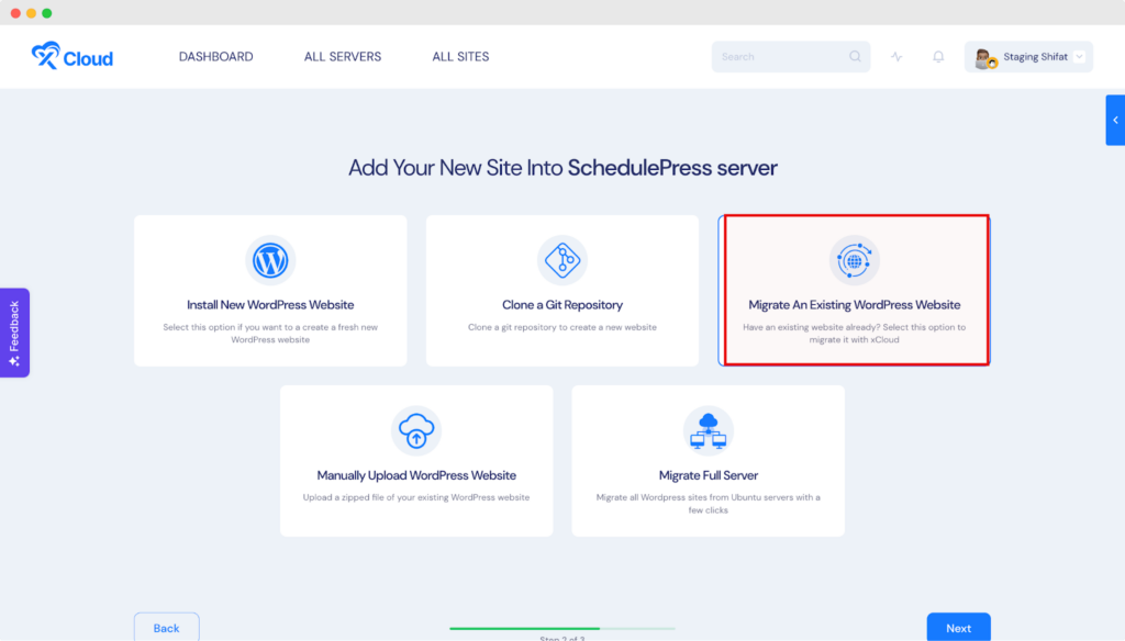 Now, Click on ‘Migrate An Existing WordPress Website’ to migrate your WordPress website with the xCloud migration plugin.