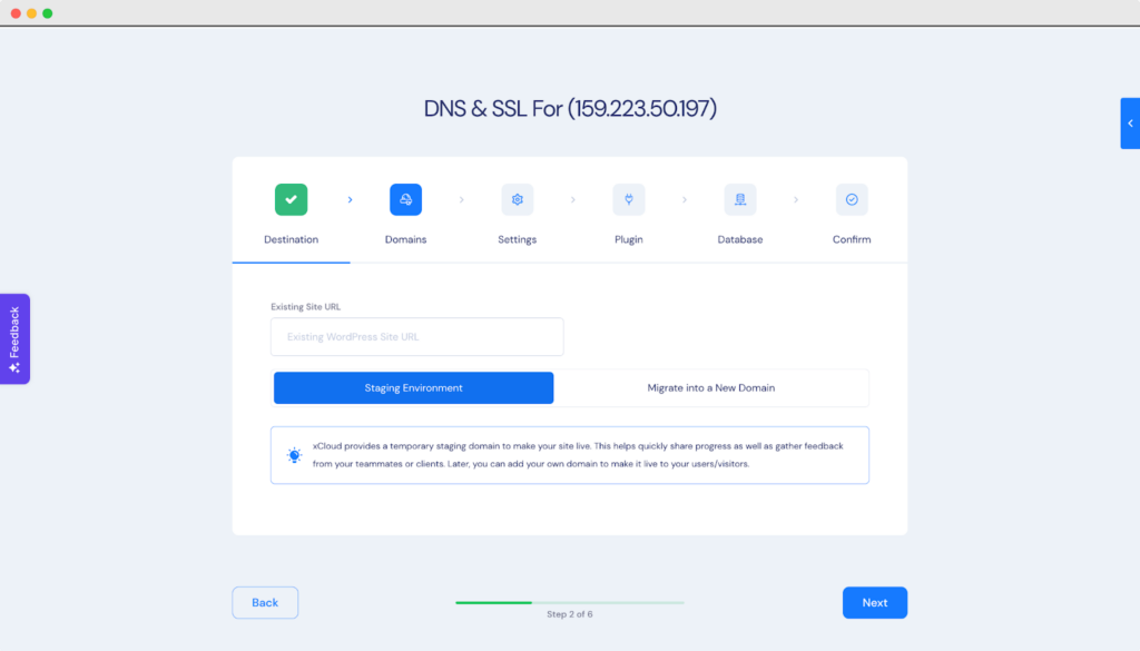 Now, choose the destination server to migrate your site and add your source site URL. Then select ‘Staging Environment’ before clicking on the ‘Next’ button.