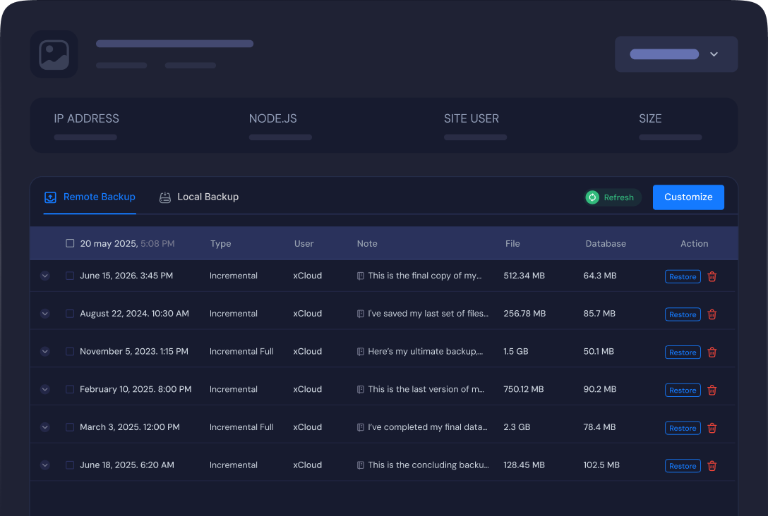 Keep your data safe with automatic backups, locally or remotely. Restore your app anytime with just a few clicks.