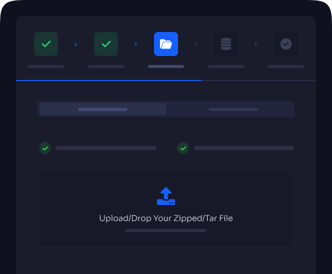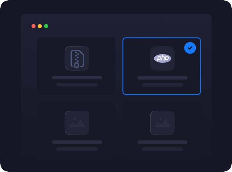 You can deploy by uploading a ZIP file or connecting a Git repo. Choose your PHP version, database, and settings. Then go live instantly.