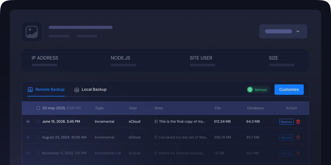 Create full or incremental backups of your site, restore versions, and roll back changes in a few clicks.